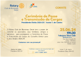 O Rotary Club Blumenau Oester, tem a honra de convidar V.S.ª. e família, para participar da reunião de transmissão de cargo e posse do presidente do ano rotário 2024-25, a ser realizada no dia 25 de junho de 2024 às 19h30, na Sede do Tabajara Tênis Club ( Stand de Tiro) em Blumenau.