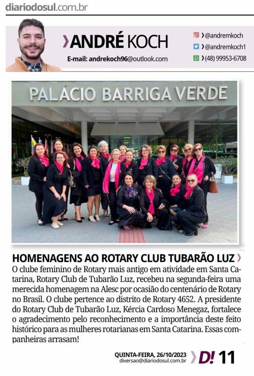 Clube feminino de Rotary mais antigo em atividade em Santa Catarina, Rotary Club de Tubarão Luz recebeu homenagem na Alesc por ocasião do centenário de Rotary no Brasil. O clube pertence ao distrito de Rotary 4652 que foi homenageado, em outras categorias também,