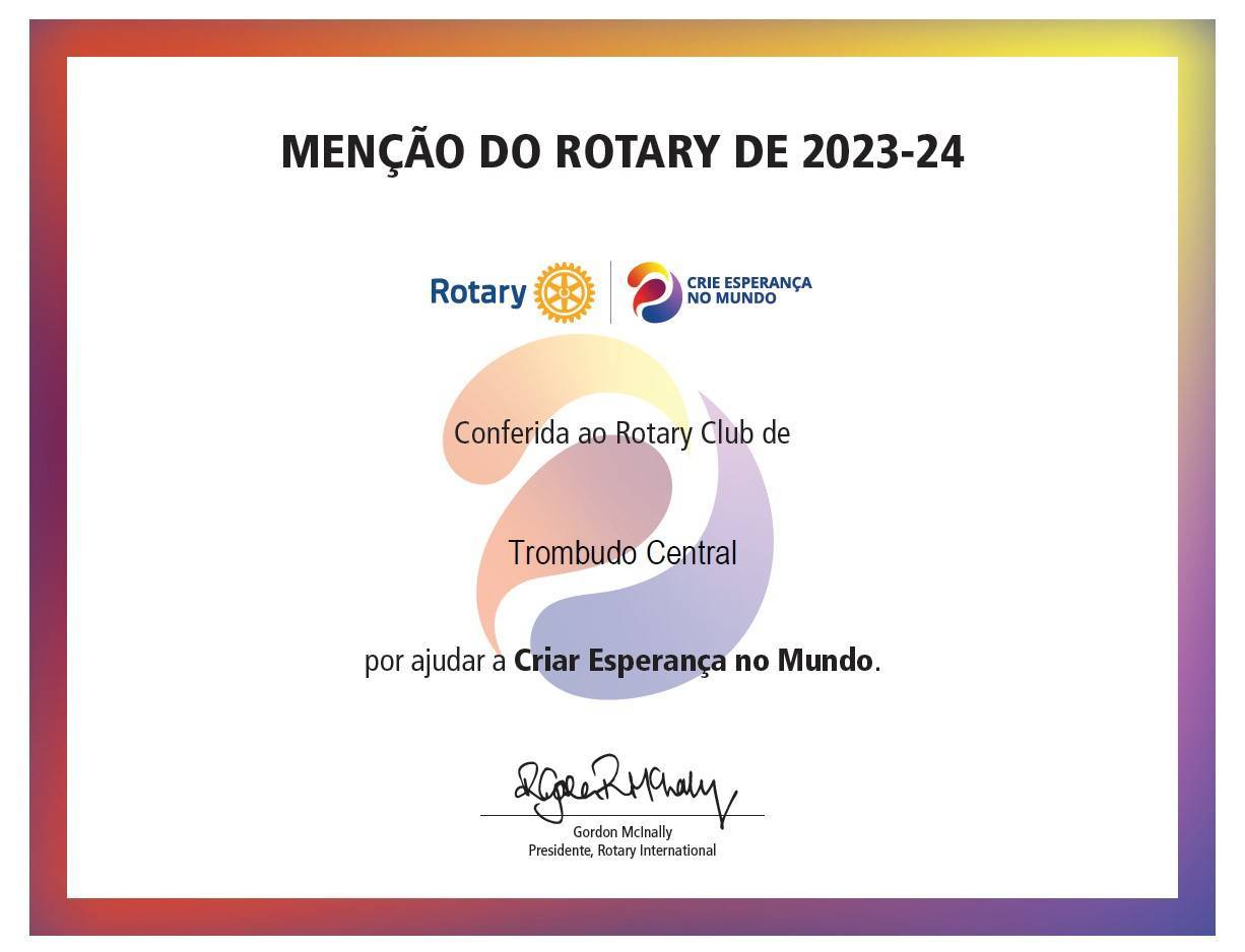Recebemos a Menção do Rotary Internacional por cumprir as metas estabelecidas, e criar esperança no mundo.