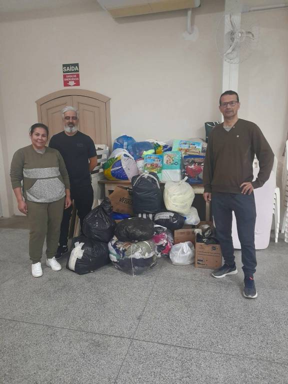 1ª Parte – No dia 09/05, enviamos uma remessa de roupas, produtos de limpeza, mantimentos e caixas d'água para apoiar nossos irmãos no Rio Grande do Sul.