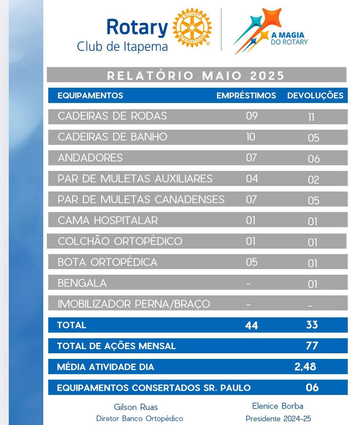 Relatório do Banco Ortopédico do Rotary Club de Itapema no *MÊS MAIO 2025
