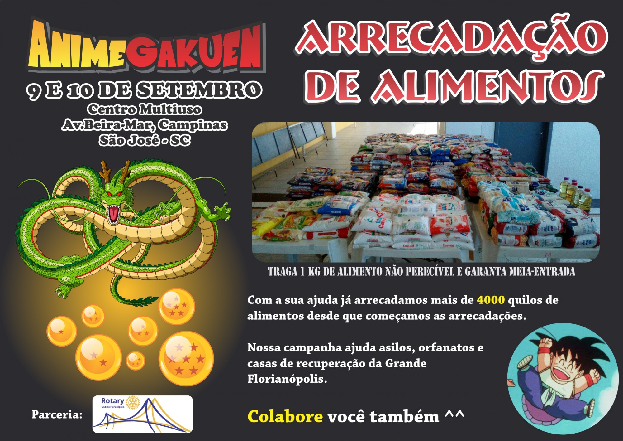 O Evento ANIME GAKUEN, que conta com a parceria do Rotary Club de Florianópolis, além de realizar importante evento com enfoque na cultura Japonesa, que já é um sucesso em nossa região, novamente está promovendo a arrecadação de alimentos não perecíveis que serão doados para os projetos sociais escolhidos em conjunto pelos organizadores do evento e o Rotary Club de Florianópolis. Participe. Viva este momento de aprendizado conhecendo a cultura Japonesa e leve seus alimentos para doação. O Rotary Faz a Diferença, faça você também!