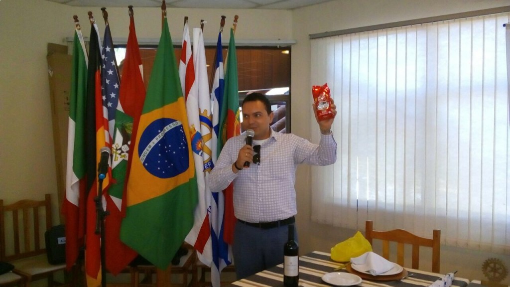 O Companheiro Josivaldo Silva, Tesoureiro do Clube, entrega ao Presidente Augusto César Zeferino a flâmula do Rotary CLub de Cali, da Colômbia, onde esteve visitando e divulgando nossos trabalhos. Trouxe de lá a experiência do Clube fundado no ano de 1929, que conta hoje com 25 membros. O Clube realiza um trabalho de arrecadação de fundos para a Fundação Rotary através da contribuição de um membro que viaja a qualquer região leva um brinde e rifa ou leiloa entre os companheiros. Além da diversão há a contribuição. Para exemplificar, o Companheiro trouxe da um quilo de Café Colombiano e rifou entre os presentes. Fazendo diferente, se faz a diferença!