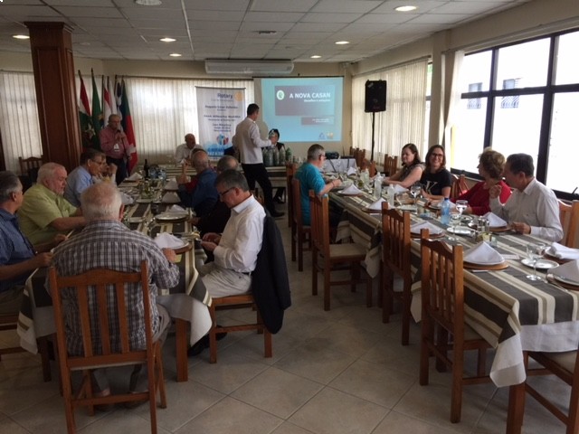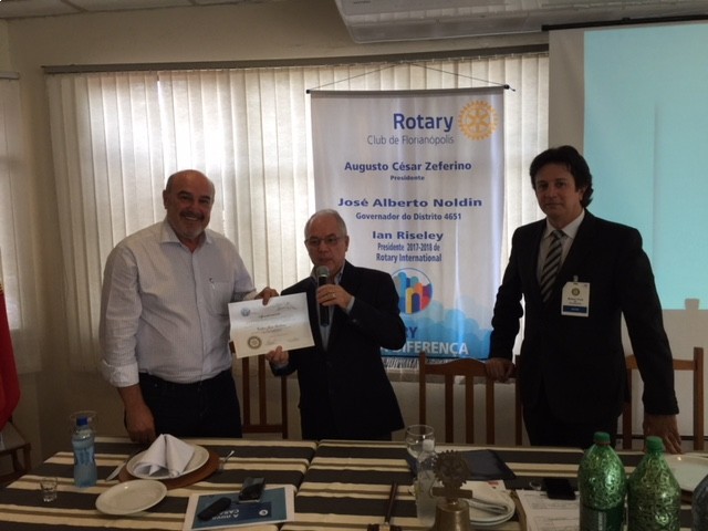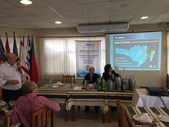 O Presidente da Casan, Valter José Gallina, fez uma importante apresentação acerca dos investimentos feitos no estado em saneamento básico, que alcançam a mais de 2 bilhões de reais. O Presidente apresentou vários projetos que estão em execução e trouxe a notícia e demonstrou como pretende despoluir a Beira Mar Norte até o final de 2018. Importante reunião com muitos esclarecimentos que fixaram a atenção de todos os companheiros. O Presidente da Casan confirmou ainda o apoio da empresa à Corrida Passos da Solidariedade fornecendo a água para os competidores. O Presidente do Clube, Augusto César Zeferino, agradeceu a palestra fornecendo o Certificado correspondente. No almoço muitos companheiros tiveram oportunidade de conversar com o convidado que se mostrou solícito aos questionamentos. O Rotary faz a diferença!