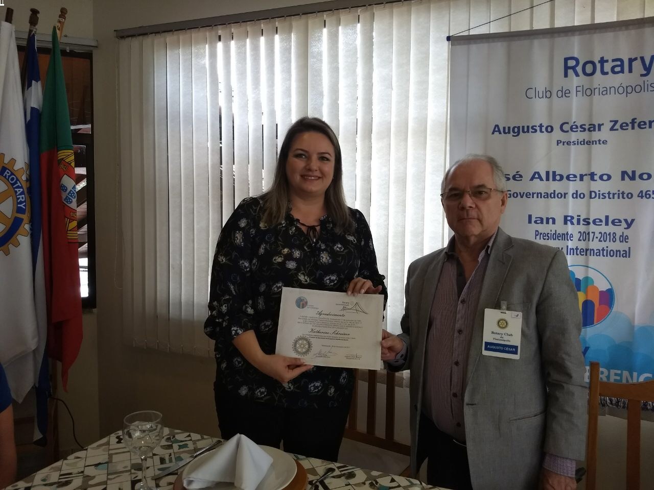 A secretária de Asssitência Social do Município, a Dra. Katherine Schreiner, foi a palestrante dessa semana no Rotary Club de Florianópolis. Trouxe detalhes sobre o campo de atuação e projetos realizados pela pasta que está sob sua coordenação. Ainda aproveitou para agradecer a parceria que o Clube tem feito em várias ações da Secretaria destinando os recursos dos projetos que arrecadam alimentos e agasalhos para as politicas públicas do Município. O Presidente trouxe informações sobre as ações do Clube e ainda foi o sorteado no Projeto do Vinho. Foi uma ótima reunião de companheirismo.