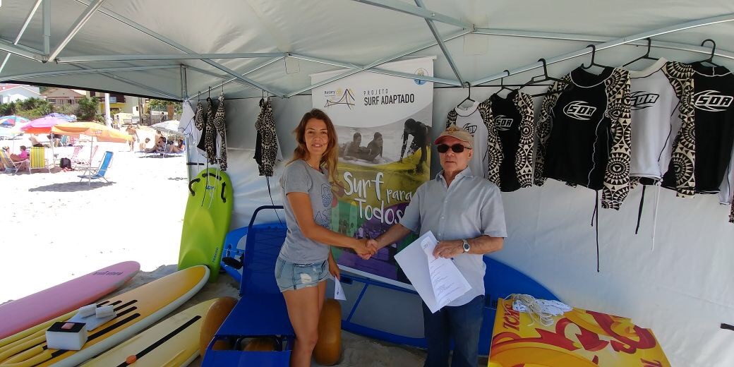 O Presidente Augusto César Zeferino entregou hoje, na Barra da Lagoa, a tenda e outros equipamentos para o Projeto Surf Adaptado. A doação dos equipamentos foram feitos à Associação Surf Sem Fronteiras que estava representada pela Companheira Ruthie Bonan Gomes, que é a tesoureira da Associação. O Presidente foi recepcionado pelos integrantes da associção e beneficiários do projeto. O Rotary Club de Florianópolis já havia doado uma cadeira anfíbia para o projeto. O projeto prevê a acessibilidade à prática de Surf para pessoas portadoras de deficiência. Unindo força e ideais o Rotary Club de Florianópolis e a Associação Surf Sem Fronteiras fazem a diferença.