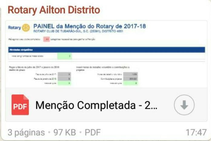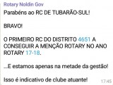 O ano de 2018 iniciou com uma excelente notícia para o Rotary Club de Tubarão-Sul: o primeiro Clube do Distrito 4651 a obter a Menção Presidencial! Este importante título é fruto do planejamento e das metas traçadas e alcançadas que fortaleceram o clube e o Distrito 4651. As metas alcançadas abrangeram quadro associativo, projetos, doações à Fundação Rotária e projeção da imagem pública do Rotary. Obter a Menção Rotary significa que o clube atingiu as metas estabelecidas pelo Presidente do Rotary Internacional e, portanto, é um clube forte. É uma forma do Rotary Internacional dizer: Parabens seu clube atingiu as metas estabelecidas pelo presidente do RI. (Associado Aristides Boeira – Grupo de discussão Meu Rotary).