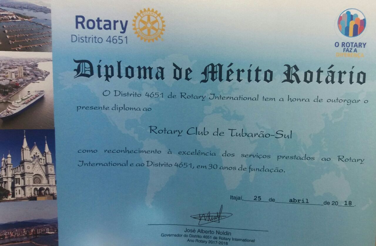 Na noite de 27 de abril de 2018, o Rotary Club de Tubarão Sul foi contemplado com o Diploma de Mérito Rotário em reconhecimento à excelência dos serviços prestados ao Rotary Internacional e ao Distrito 4651, em 30 anos de fundação.