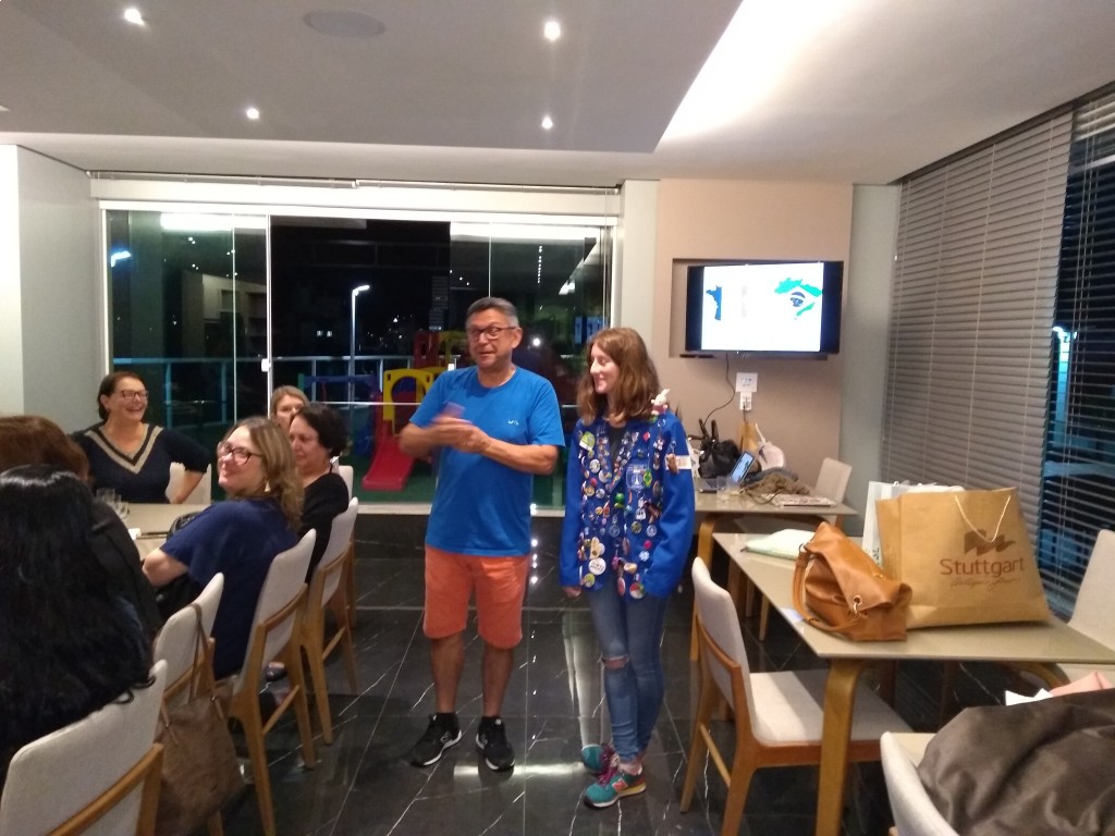 No último dia 29/05, em reunião de toda a família rotária do nosso club e com a presença especial de convidados, entre eles o presidente do Rotary Club Hermann Blumenau, companheiro Valmire e esposa, tivemos a emocionante apresentação da experiência da nossa inbound Margot. Os nossos maiores agradecimentos aos pais Ricardo, Emerson e Pisa e seus familiares pelo acolhimento neste ano.