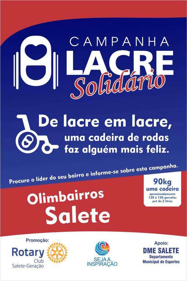 O Projeto “Lacre Solidário” é executado pelo Rotary Club Salete-Geração, que ao perceberem a necessidade de investir no seu próprio desenvolvimento pessoal, social e profissional aplicam parte de seu tempo em juntar lacres de alumínio para serem revertidos por cadeiras de rodas que são doadas para entidades como Hospitais e APAES.
