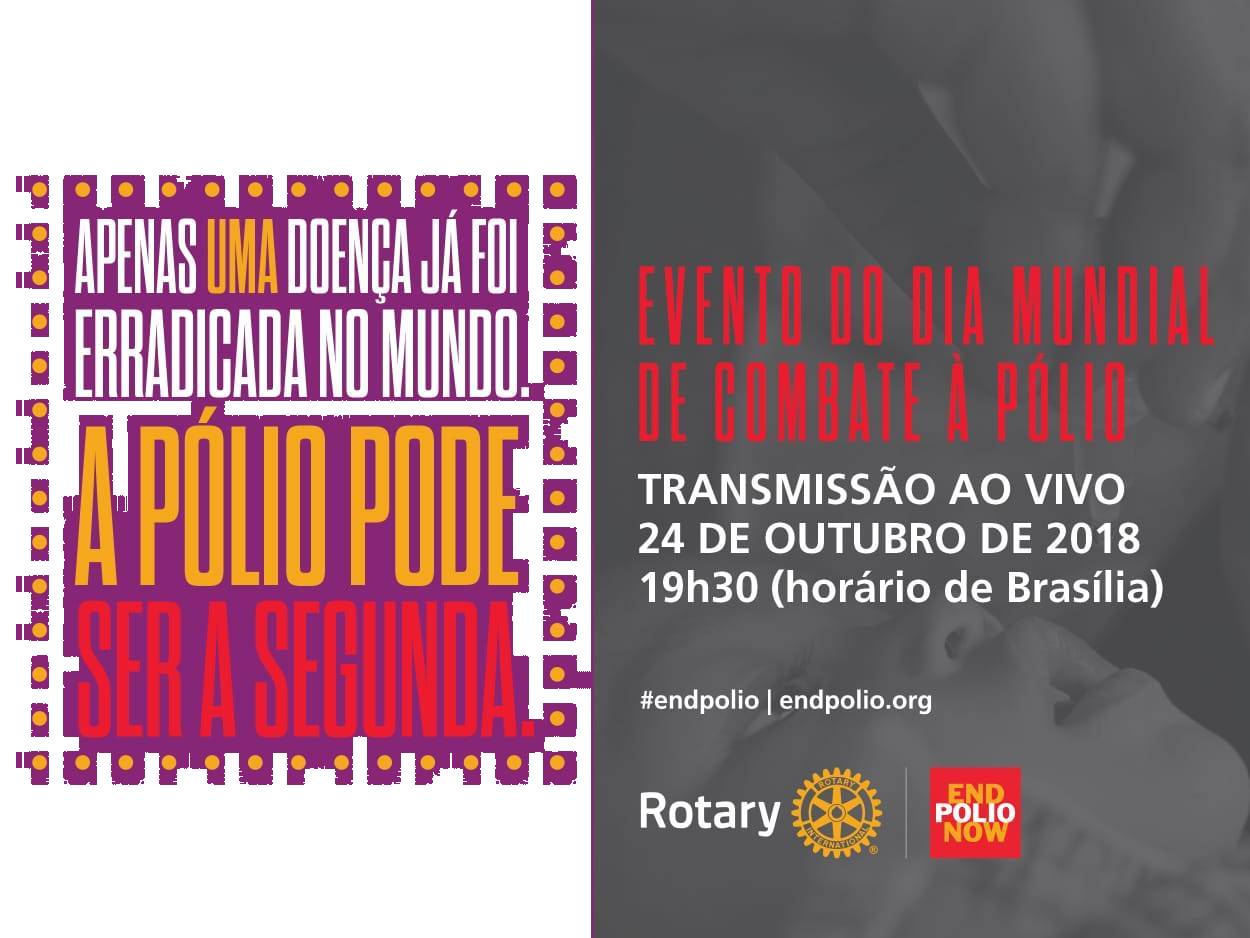 Nesta quarta-feira, 24 de outubro, os 35,4 Rotary Clubs do planeta estarão mobilizados para celebrar o Dia Mundial de Combate à Pólio. Diversas ações de conscientização estão sendo programadas. O principal ocorrerá às 19h30 (horário de Brasília), no College of Physicians, na Filadélfia (EUA), com transmissão ao vivo pela internet.